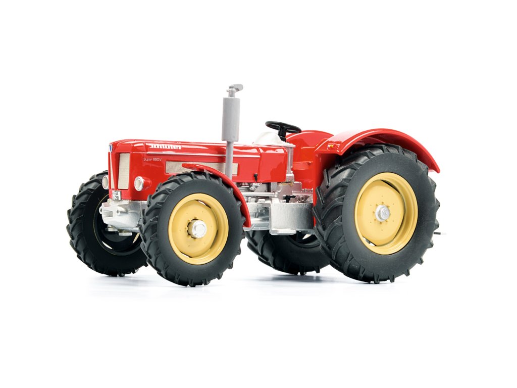 Model traktoru Schlüter Super 950 V v měřítku 1:32, jehož zpracování odpovídá tradičně velmi vysokým standardům značky Schuco. Hotový (sestavený) sběratelský model. Určen k vystavení.